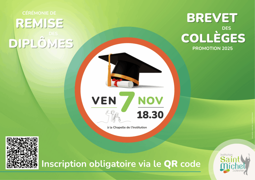 La cérémonie de remise des diplômes du Brevet des Collèges aura lieu le vendredi 7 novembre à 18h30, à la chapelle de l’Institution.