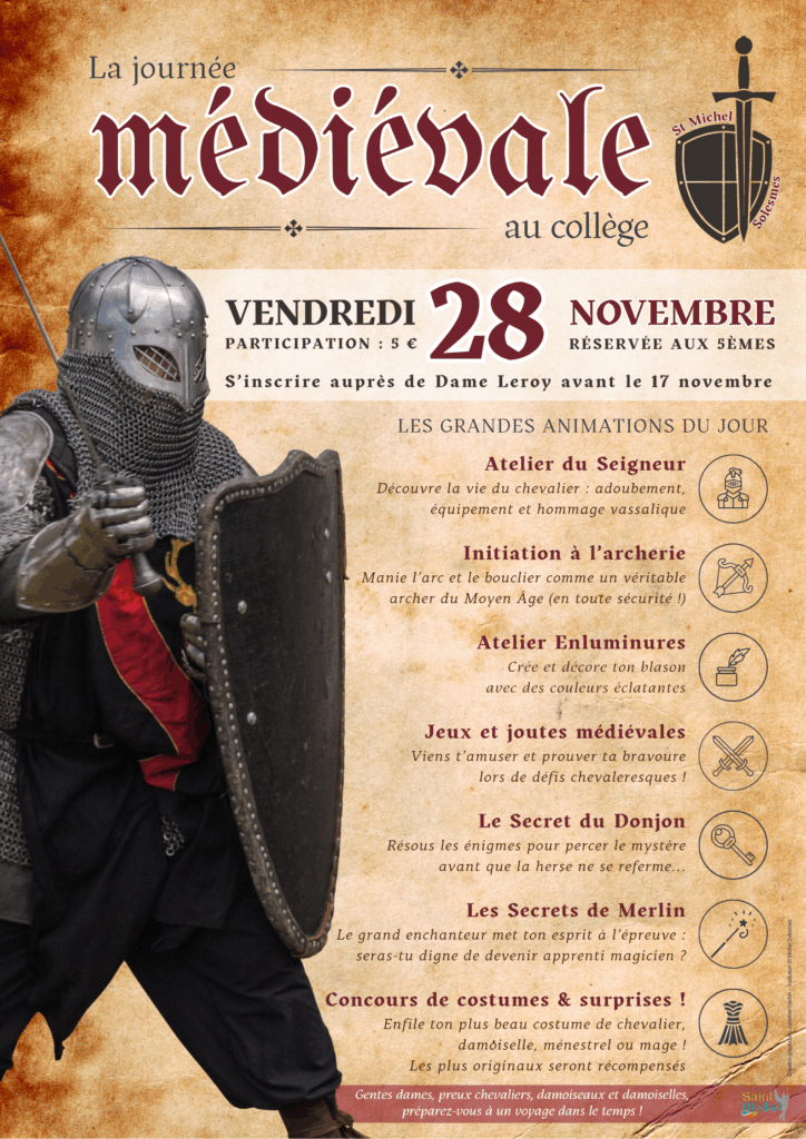 Le vendredi 28 novembre, les 5ᵉ partiront à la découverte du Moyen-Âge à travers moult ateliers et animations dignes des grandes fêtes d’antan :