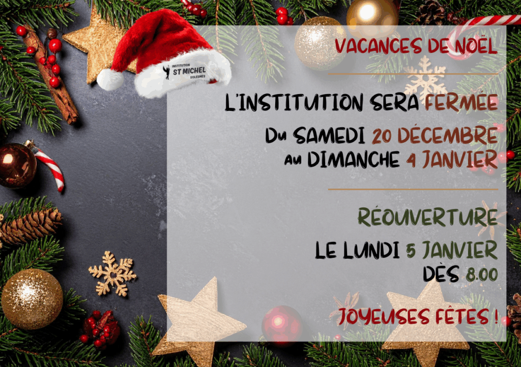 À l’occasion des vacances de Noël, l’Institution St Michel sera fermée du samedi 20 décembre au dimanche 4 janvier inclus.