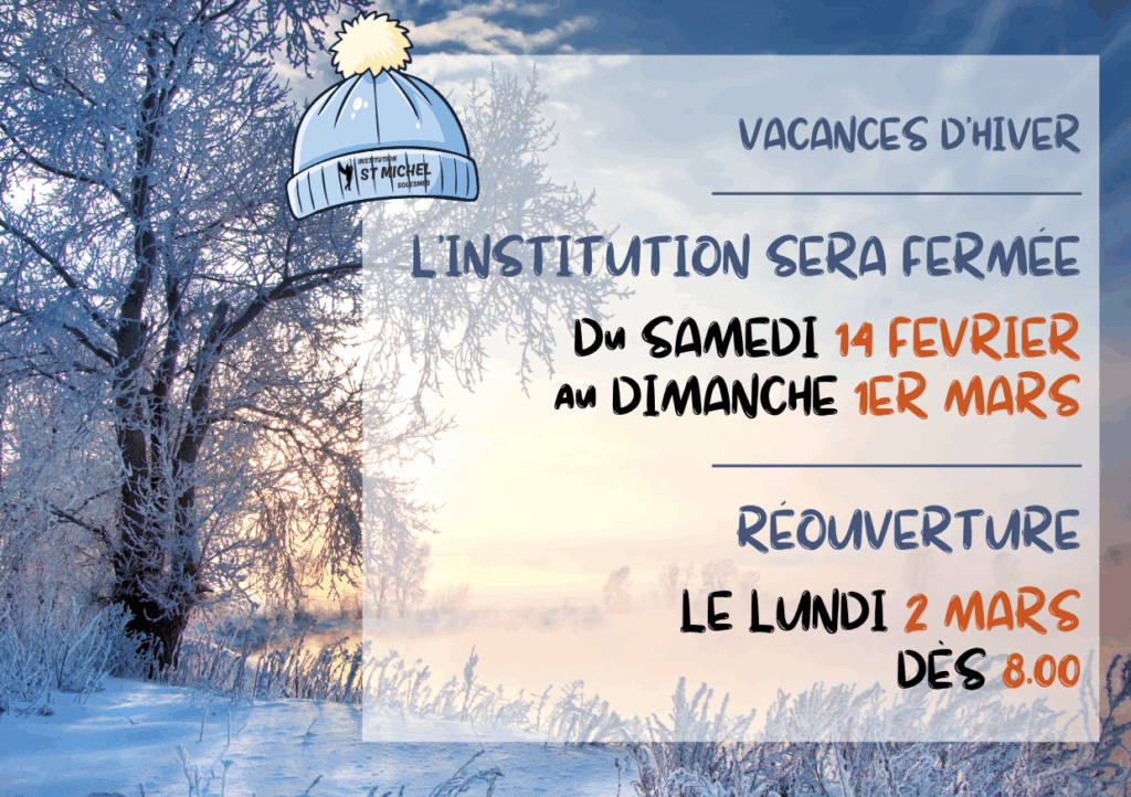 À l’occasion des vacances d’hiver, l’Institution St Michel sera fermée du samedi 14 février au dimanche 1er mars inclus.