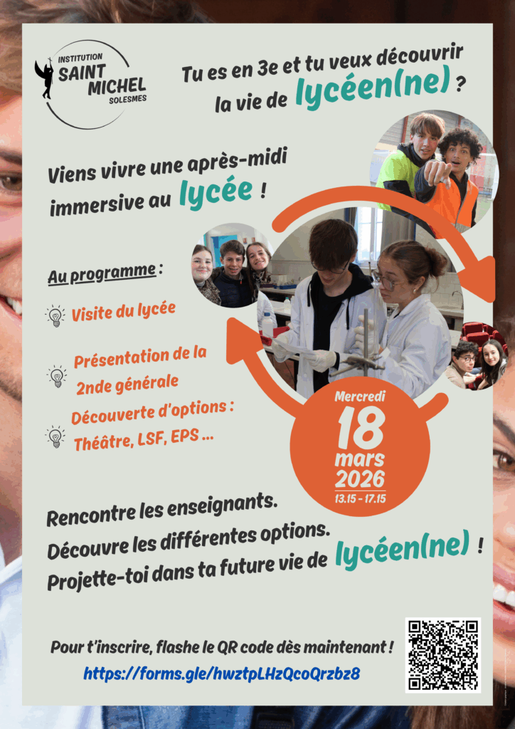 L’Institution St Michel propose aux élèves de CM2 (hors réseau Saint-Pierre) et de 3ᵉ de vivre une journée d’immersion afin de découvrir leur futur établissement dans un cadre convivial et rassurant.