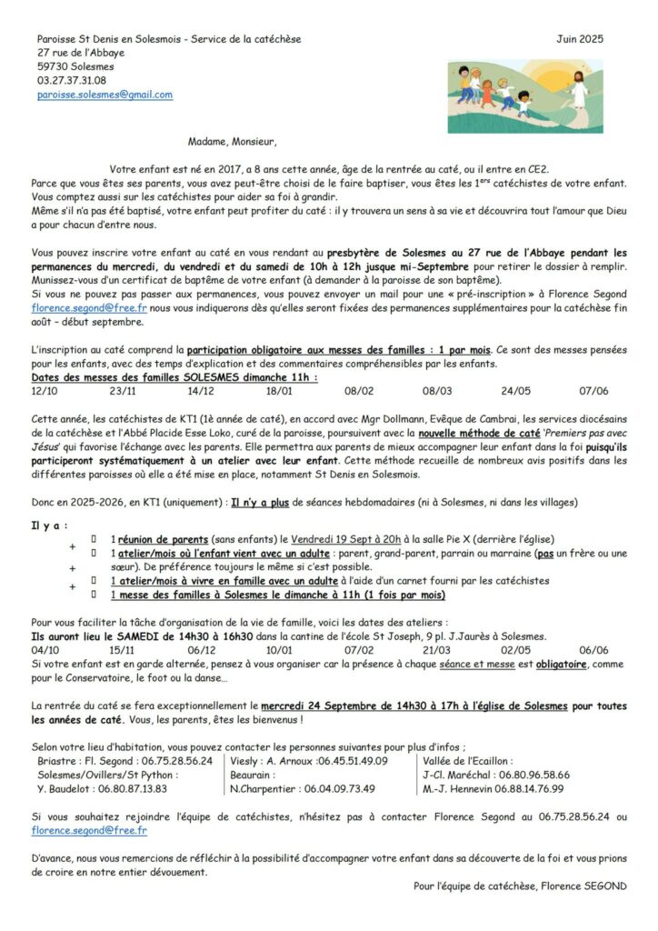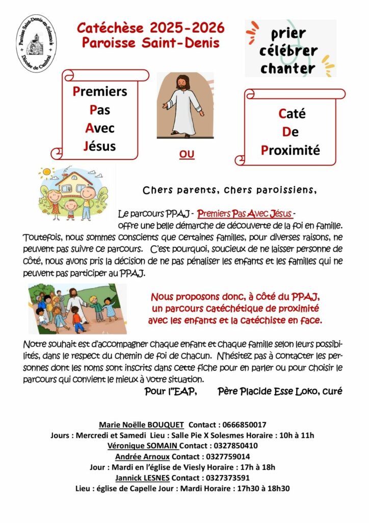En complément des informations diffusées par la paroisse, le parcours « Premiers Pas Avec Jésus » est proposé aux élèves en première année de catéchisme. Ce parcours permet aux jeunes de découvrir la foi à travers des activités adaptées à leur âge et de vivre des temps de rencontre, de prière et de partage.