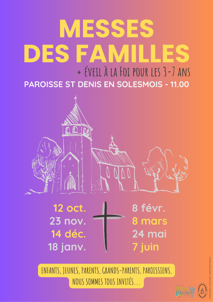 La paroisse St Denis en Solesmois invite enfants, jeunes, parents, grands-parents et tous les paroissiens à participer aux messes des familles, célébrées à 11h, aux dates suivantes :